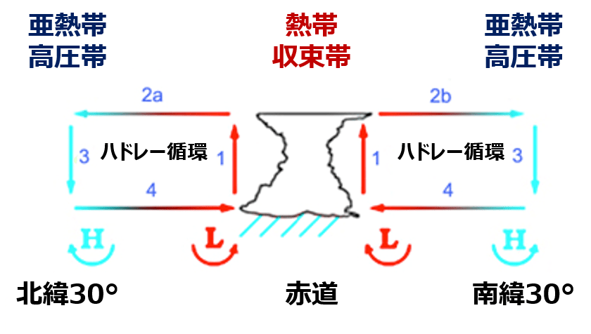 ハドレー循環では、上空の大気は赤道から緯度30°付近に流れ、地表では緯度30°から赤道へ向かって風が吹きます。