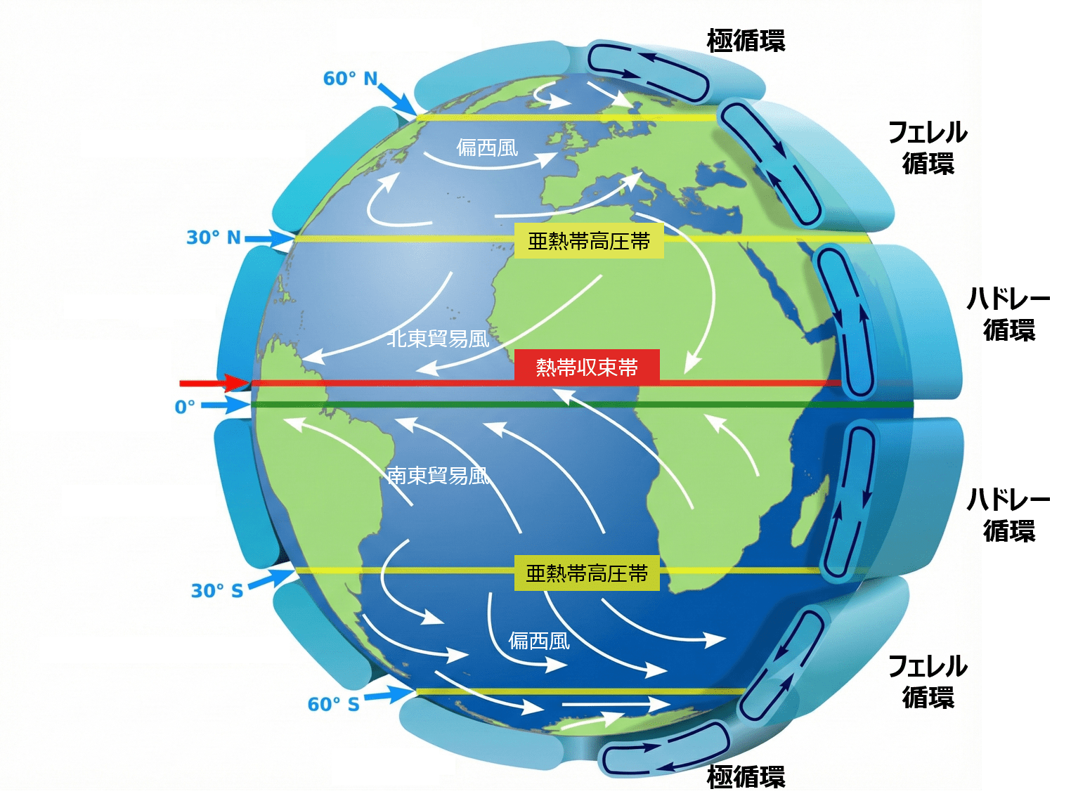 大気大循環(ハドレー循環・極循環・フェレル循環)