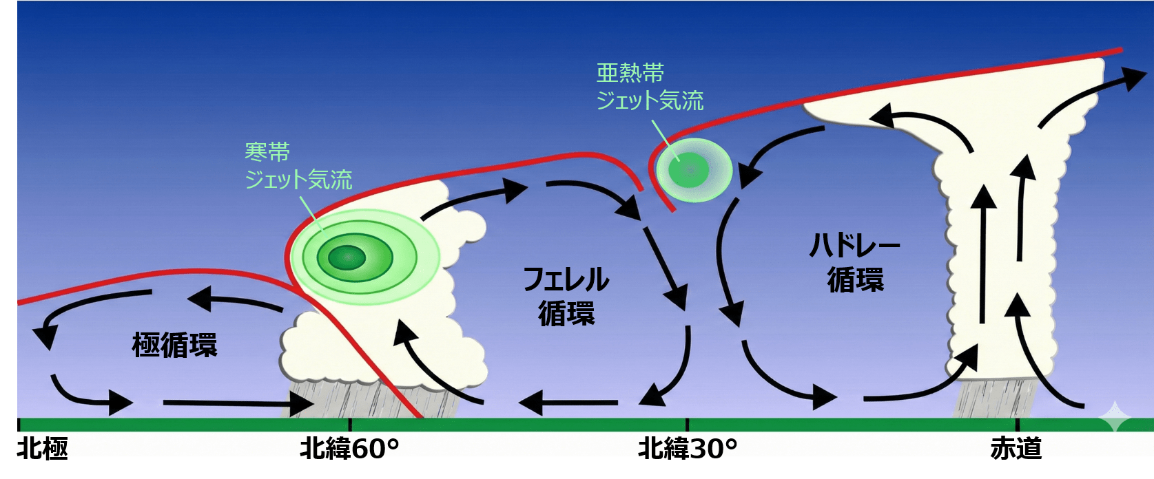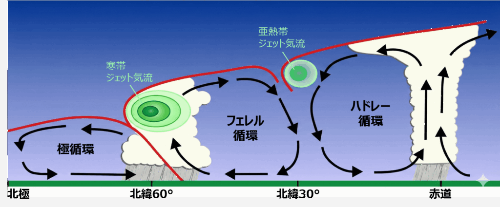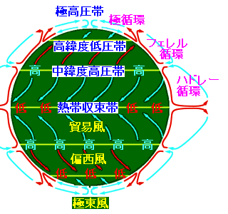 このようにフェレル循環ハドレー循環極循環によってつくられた見かけ上の循環です。