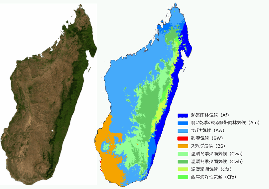 また、インド洋の島国であるマダガスカルでは、南半球の低緯度に位置するためベースとなる気候は熱帯(A)です。