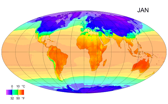 1961-1990年の世界月別平均気温の分布図(アニメーション)。赤道に近い低緯度地域ほど気温が高く、北極や南極に近い高緯度地域ほど気温が低い傾向がある。同じ緯度でも中緯度の大陸東岸(東アジア)は大陸西岸(西ヨーロッパ)よりも冬の気温が低い傾向がある。これは、大陸西岸(西ヨーロッパ)が年中暖流の影響をうけて温暖であるのに対し、大陸東岸(東アジア)は季節風(モンスーン)の影響で冬は冷たい北西風の影響をうけるという違いに起因する。出典:Wikimedia Commons, ©PZmaps, CC BY-SA 3.0, 2025/11/11閲覧