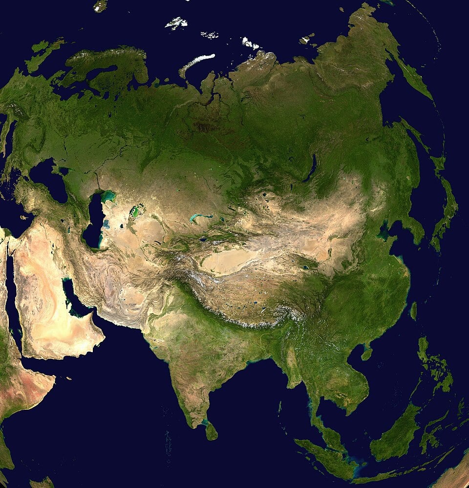 アジアの衛星画像。ユーラシア大陸の中央部(中央アジアや中国西端部)は海洋から離れており(=隔海度が高いため)、水蒸気の供給が少ないため砂漠が広がる。なお、左側のアラビア半島などに広がる砂漠は、中緯度高圧帯(亜熱帯高圧帯)に起因する。出典:Wikimedia Commons, Public domain, 2025/11/15閲覧