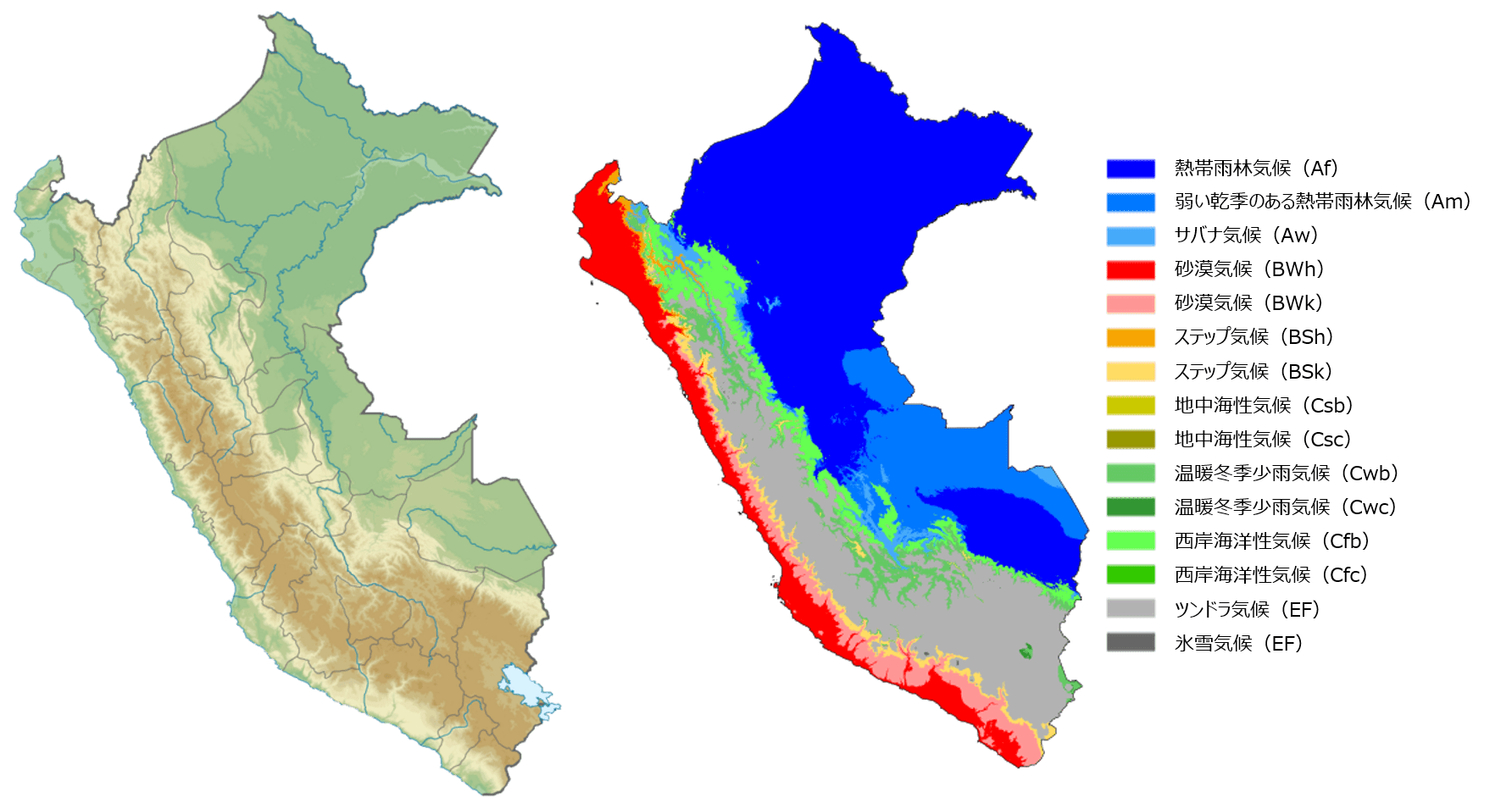 ペルーの地形(左)と気候(右)。左はペルーの地形の起伏を表現した地図であり、西端の沿岸部や東部は低地であるのに対し、アンデス山脈が南北に貫く中央部は標高が高い。このような地形がペルーの気候に大きな影響を与えている。大陸西岸の赤道直下から南緯18°に位置する西海岸の低地では、沖合を流れる寒流の影響で年中乾燥した砂漠気候(BW)が広がる。一方、東部の低地は熱帯雨林気候(Af)であり、アマゾンの熱帯雨林が広がる。国土の中央部は標高が高いため、中腹部ではステップ気候(BS)や温帯(C)を呈し、標高が高い場所では寒帯(E)となる。このように、ペルーでは標高や大陸内の位置関係に応じて様々な気候が見られる。出典を加工して作成。出典:(左)Wikimedia Commons, ©Marcomogollon, CC BY-SA 4.0, 2025/11/12閲覧 (右)Wikimedia Commons, ©Beck, HE, Zimmermann, NE, McVicar, TR, Vergopolan, N., Berg, A., & Wood, EF, CC BY 4.0, 2025/11/12閲覧