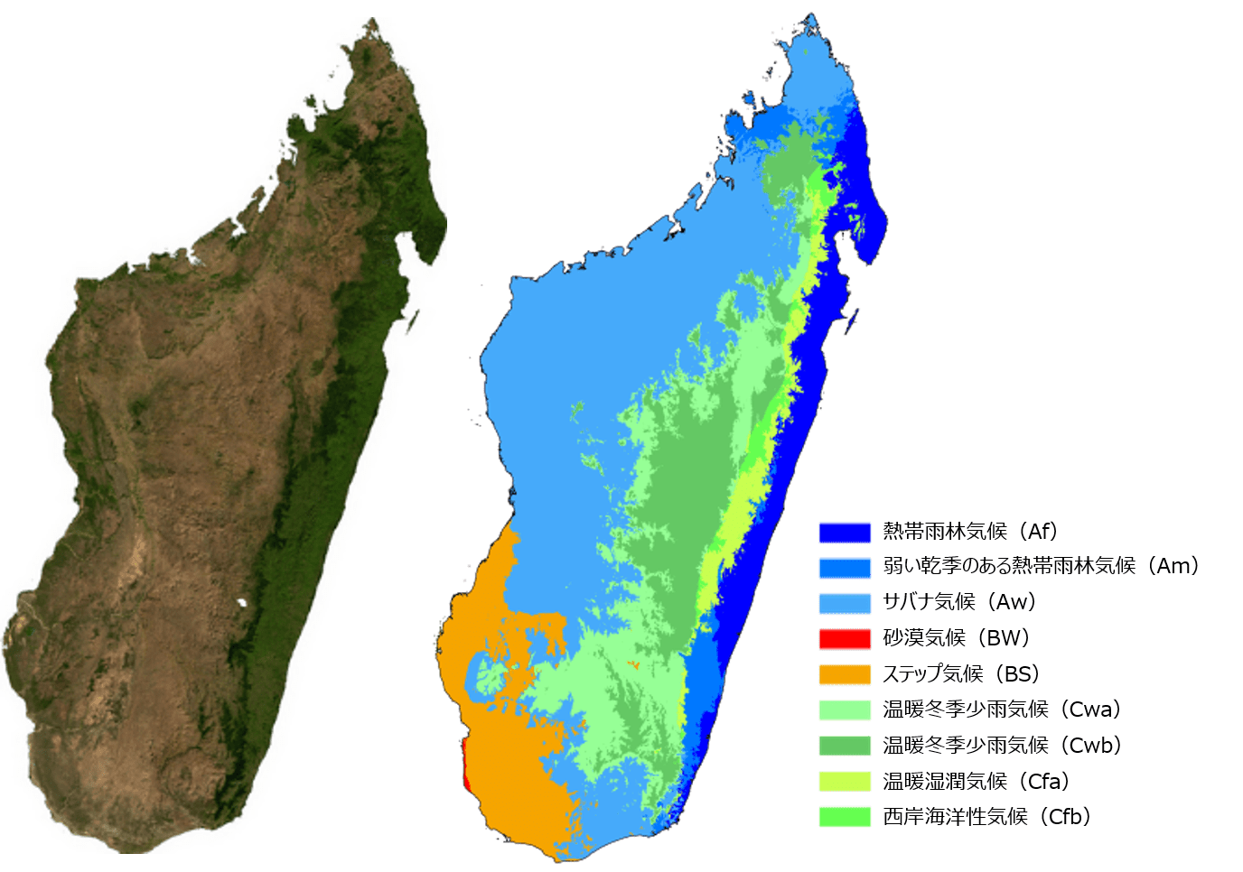 マダガスカルの地形(左)と気候(右)。左はマダガスカルの衛星画像であり、熱帯雨林が広がる東海岸の低地部が濃緑色になっており、標高が高い中央部や乾燥した南西部は茶色が目立つ。右側はケッペンの気候区分であり、地形に応じた気候分布になっている。マダガスカルは南東貿易風の影響を受け、東海岸が年中多雨の熱帯雨林気候(Af)であるのに対し、常に雨陰になる南西部は乾燥帯(B)である。出典を加工して作成。出典:(左)Wikimedia Commons, Public Domain, 2025/11/11閲覧 (右)Wikimedia Commons, ©Beck, HE, McVicar, TR, Vergopolan, N., Alexis, B., Lutsko, NJ, Dufour, A., Zeng, Z., Jian, X., van Dijk, AIJM, Miralles, DG, CC BY 4.0, 2025/11/11閲覧