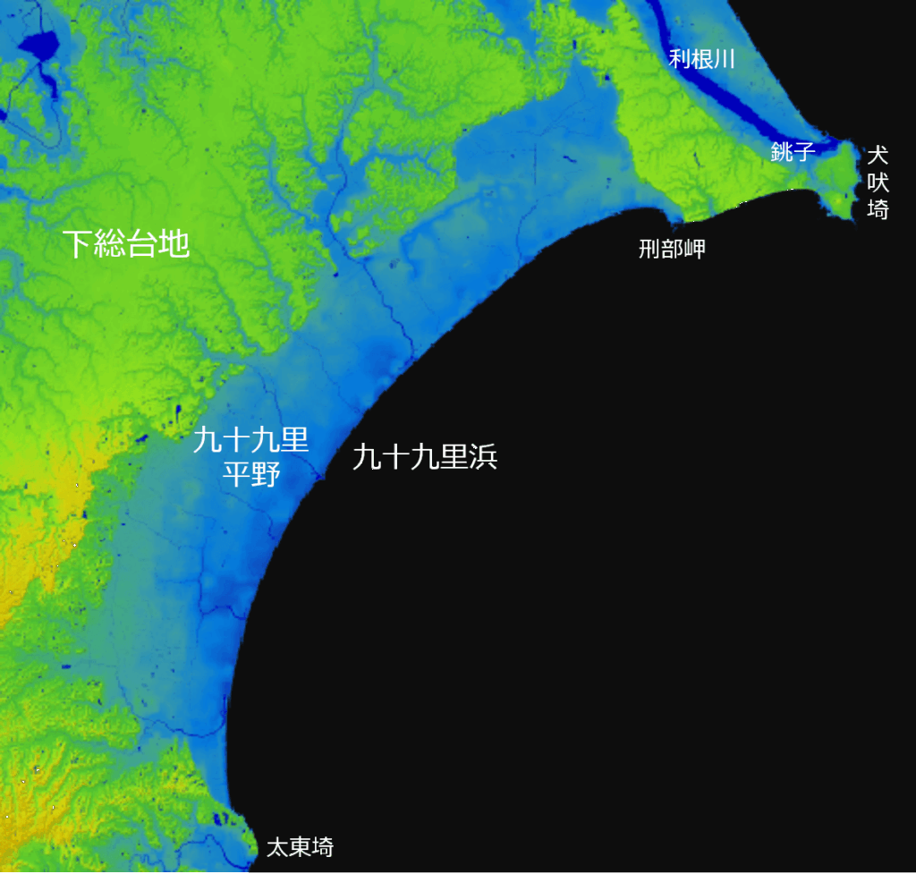 上の地図(起伏図)でも、河川沿いの低地(水色)は氾濫原、河川から離れた高台(薄緑色)は台地(洪積台地)となっています。