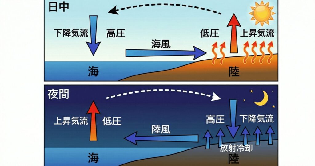 一方、夜には放射冷却によりも陸地の気温が低下していき、気温が相対的に高くなった海洋側で上昇気流が発生し、それを補うように陸地側で下降気流が発生します。