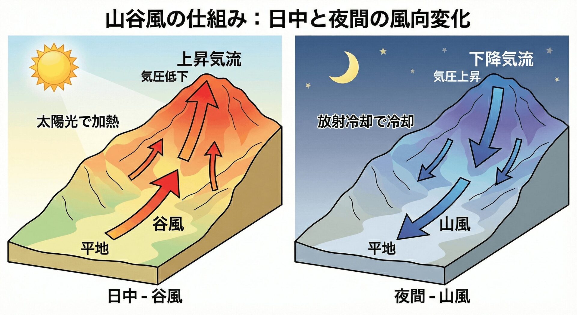 山谷風(やまたにかぜ)は、山間部において山頂部(稜線)と谷筋の温度差により日中と夜間で風向きが逆になる風のことです。