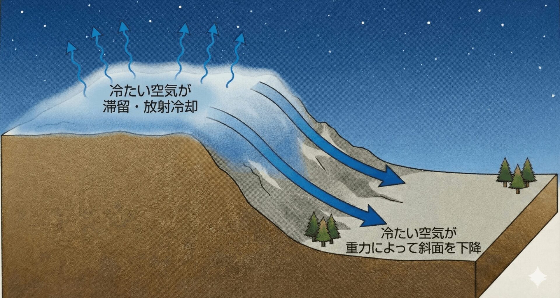 このため、山頂から斜面を下り、谷筋を山から平地に向かって下る山風(やまかぜ)が吹きます。