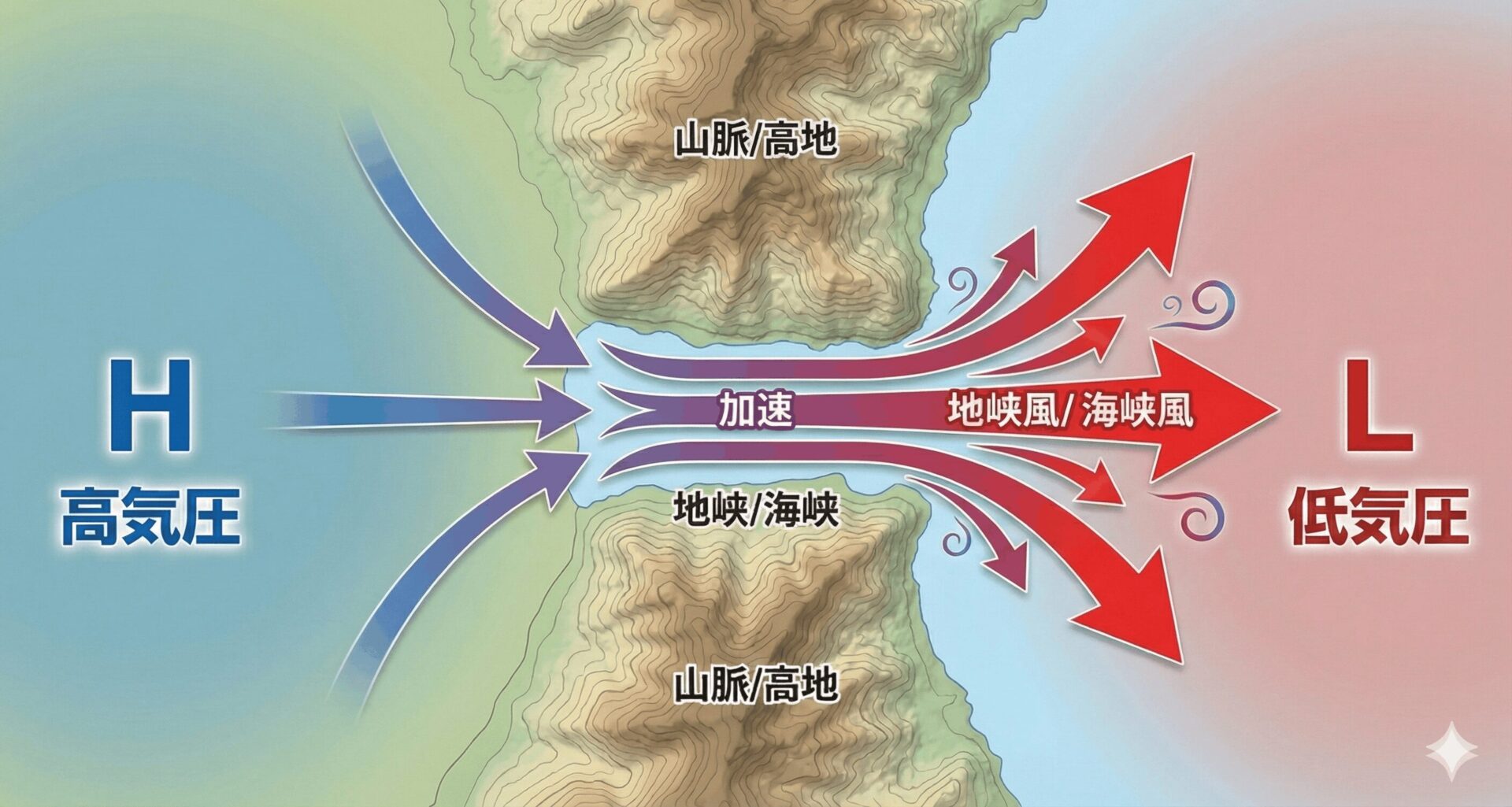 以下では、地峡風(海峡風)と滑降風について順に解説します。