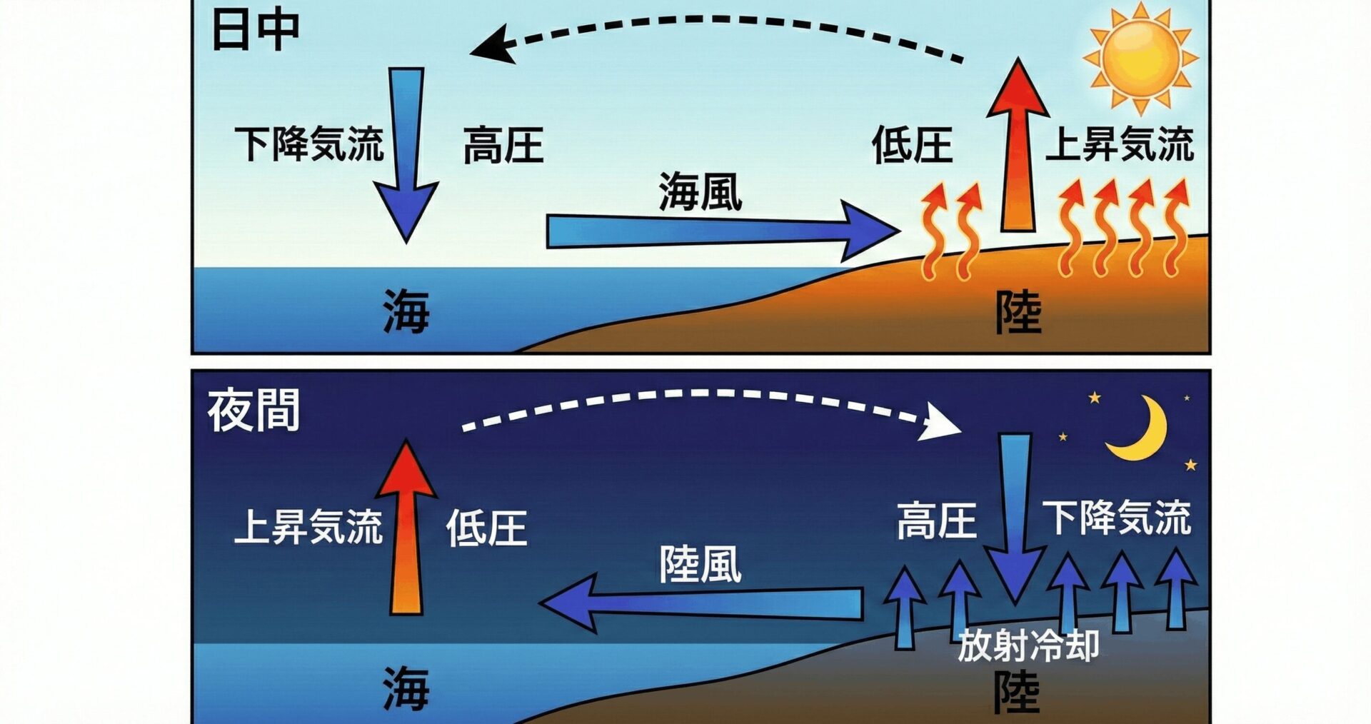 海陸風(かいりくふう)は、海と陸の温度差により日中と夜間で風向きが逆になる風のことです。