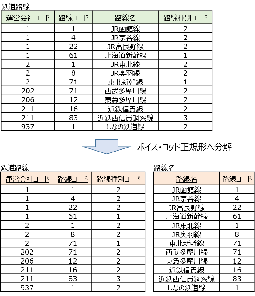 第3正規形までは情報無損失分解(=表を自然結合すると分解前の表を復元できる)ですが、ボイス・コッド正規形への表分割は情報無損失分解ではありません。