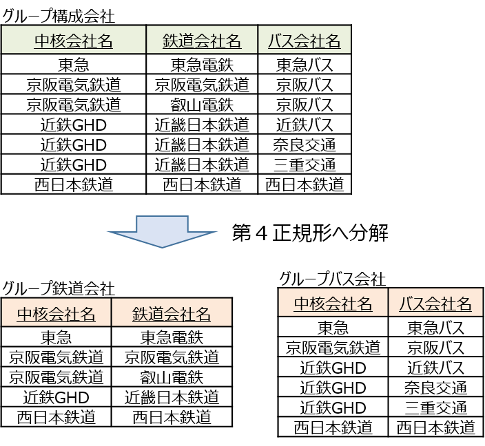 関数従属の場合はこのような関係性が1つしかなく分解できない場合であり、多値従属の場合はこのような関係が2つのテーブルに分解できる場合を指します。