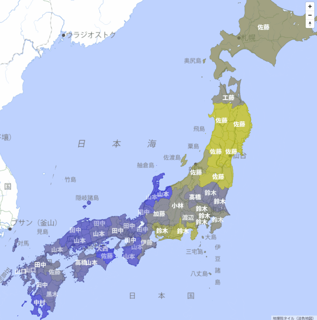 以上のように、日本苗字アトラスを使うことで苗字の分布を簡単に「眺める」ことができます。