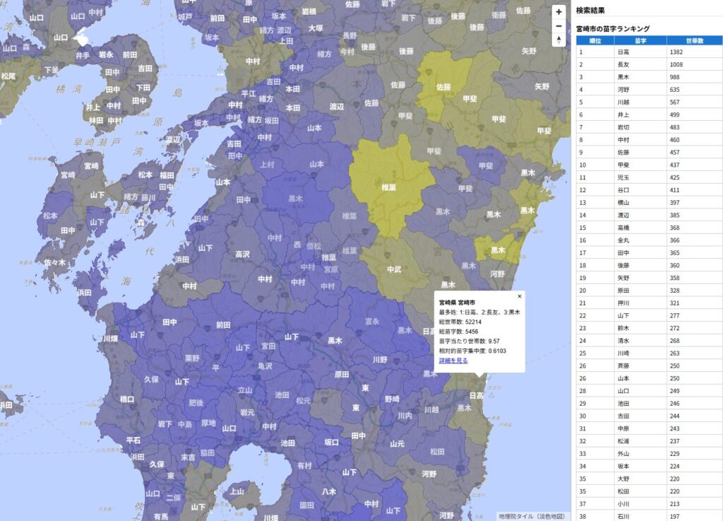 九州南部の市町村別の最多性。宮崎市の苗字ランキング選択している。宮崎市では最多性が「日高」であり、「長友」「黒木」と続く。宮崎県では上位を占める苗字も日本全体とは大きく異なる。出典:日本苗字アトラス 2025/10/26閲覧