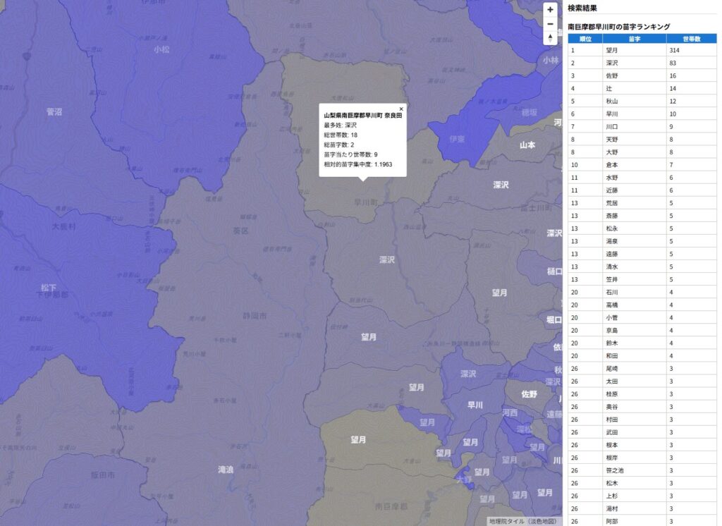 赤石山脈(南アルプス)周辺の町丁目別の最多性分布。山梨県早川町奈良田を選択している。右側のランキングでは早川町全体の苗字ランキング(世帯数ベース)である。早川町(734世帯)では最多性が「望月」が314世帯(42%)であり、2位の「深沢」の83世帯(11%)と合わせて過半数を占め、3位の「佐野」で16世帯まで減り、特定の苗字が高い割合を占める。出典:日本苗字アトラス 2025/10/26閲覧