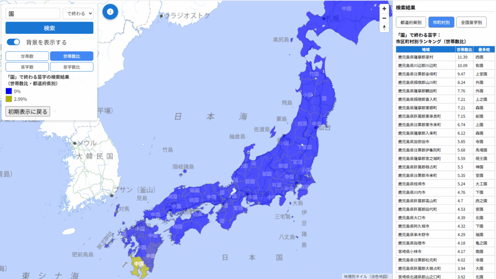 検索機能もあるため、ある苗字がどのように分布しているかも確認できます。