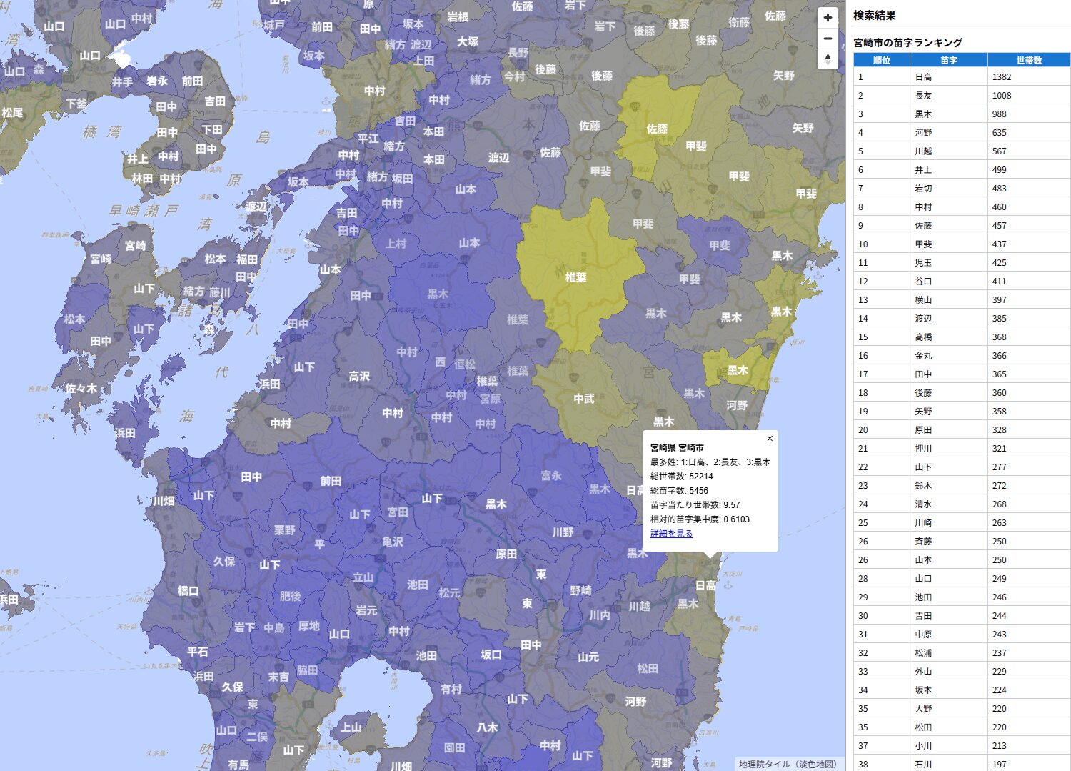 以上のように、日本苗字アトラスを使うことで苗字の分布を簡単に「眺める」ことができます。