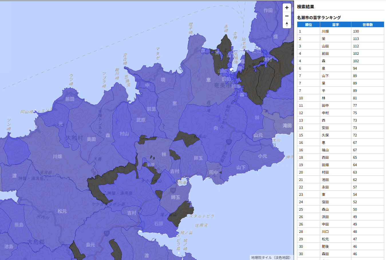 ここからは、市区町村別をさらに細分化した町丁目別のスケールで苗字の分布を見ていきます。