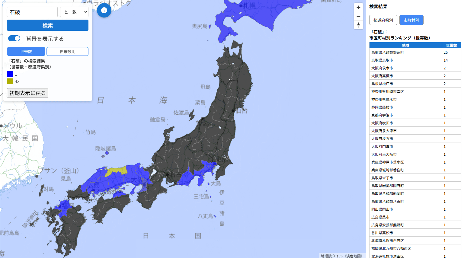 検索機能もあるため、ある苗字がどのように分布しているかも確認できます。